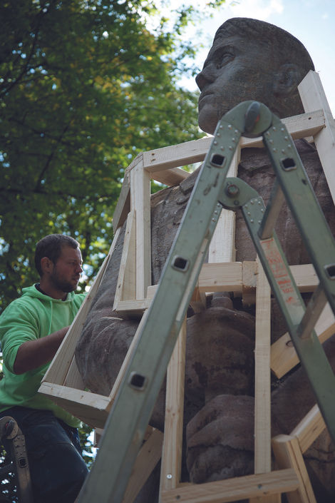»Instead of being created independently, ‘Schalung’ is a direct reaction to a very controversial, historically charged sculpture dating back to the aesthetic and ideological values of National Socialism. Commissioned by the Nazis in the 1940s as a heroic ‘warrior memorial’, as soon as it was completed it was encased in a wooden crate as it was only supposed to be unveiled once ‘total victory’ had been achieved. It was hence concealed inside wooden boarding for many years until politicians finally remembered it and erected it as a ‘warrior memorial’ in the town of Göppingen, where it can still be seen. I regard ‘Schalung’ as a kind of ‘anti-sculpture’. Given its appearance as planking or casing, it questions the possibility of neutralizing art from society. It also addresses the political and ideological functionalization of art and its associated misuse.«