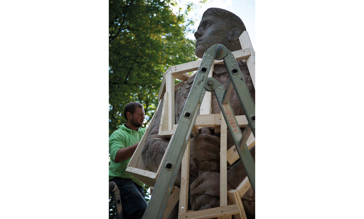 Instead of being created independently, ‘Schalung’ is a direct reaction to a very controversial, historically charged sculpture dating back to the aesthetic and ideological values of National Socialism. Commissioned by the Nazis in the 1940s as a heroic ‘warrior memorial’, as soon as it was completed it was encased in a wooden crate as it was only supposed to be unveiled once ‘total victory’ had been achieved. It was hence concealed inside wooden boarding for many years until politicians finally remembered it and erected it as a ‘warrior memorial’ in the town of Göppingen, where it can still be seen. I regard ‘Schalung’ as a kind of ‘anti-sculpture’. Given its appearance as planking or casing, it questions the possibility of neutralizing art from society. It also addresses the political and ideological functionalization of art and its associated misuse.